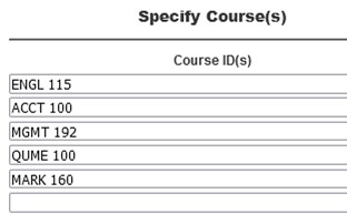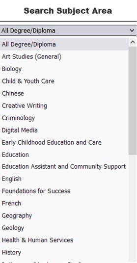 - On the next page enter the names and numbers of all the courses you would like to enrol in, for example: ENGL 115, MATH 111, PSYC 112, etc. You can also search for and select your courses from the Search Subject Area drop-down list.