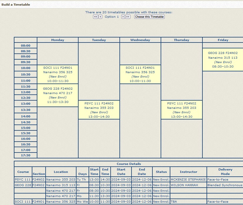 - On the next page you will see up to 20 different timetable variations of a weekly schedule using the courses you have chosen. You will be able to see which ones are in conflict or full, and all schedule details. The best options will usually be at the top of the list.